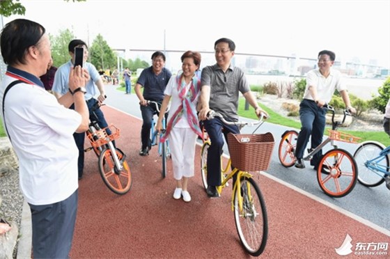 韩正骑共享单车体验滨江骑行环境(图)